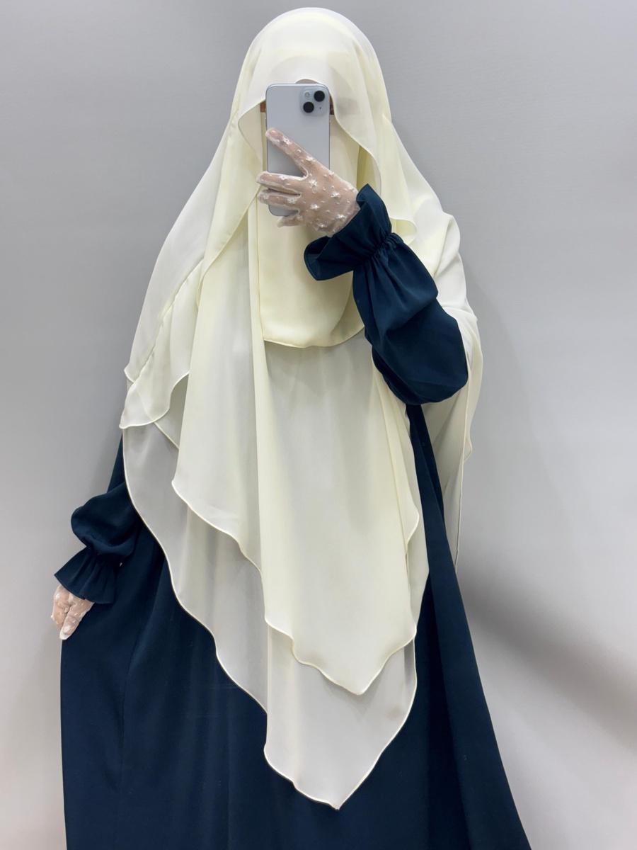 خمار فرنسي من ساتر هو عبارة عن خمار فرنسي مثلث من الأمام بشكل مميز وعصري ودائري ماليزي من الخلف لكي يكون ساتر كامل للظهر